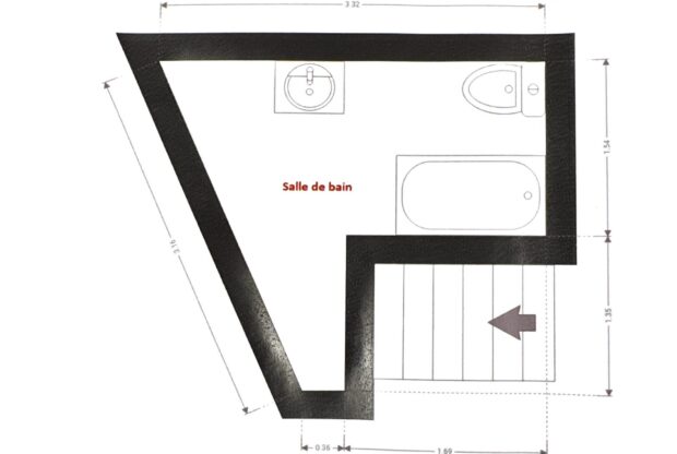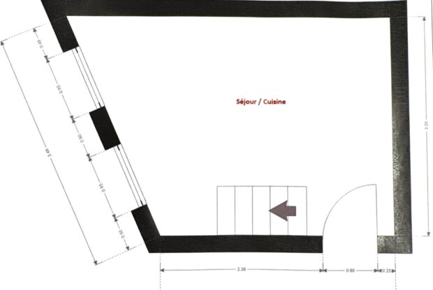 Entrée, séjour avec coin cuisine. Rez de jardin : salle de bains wc