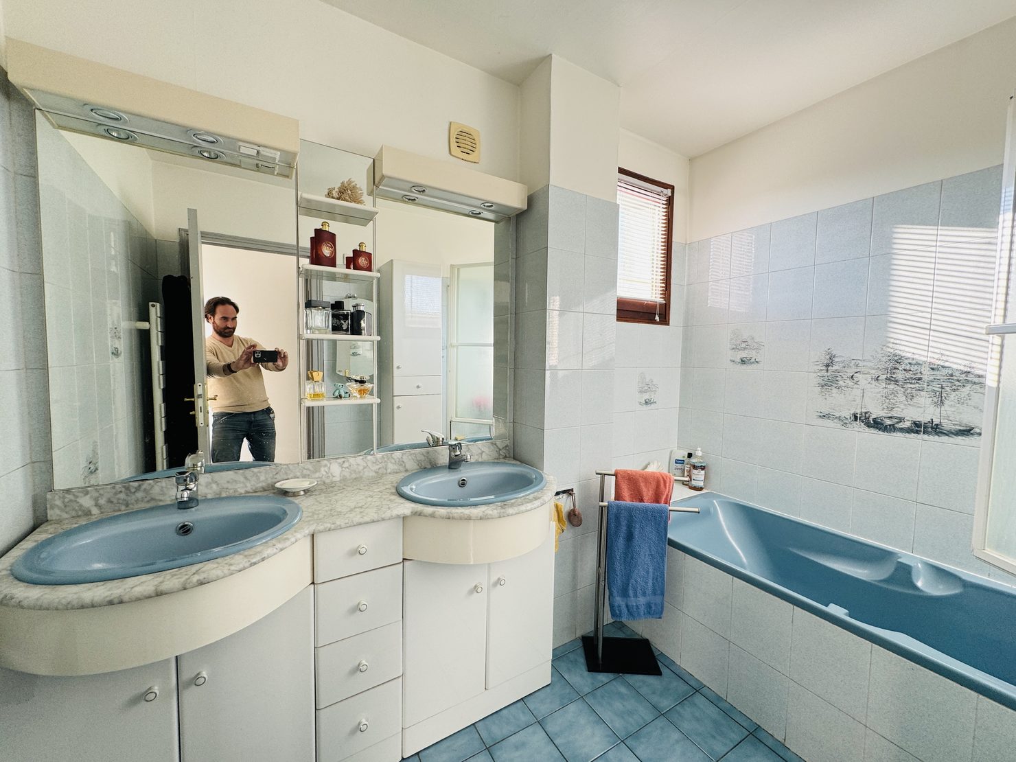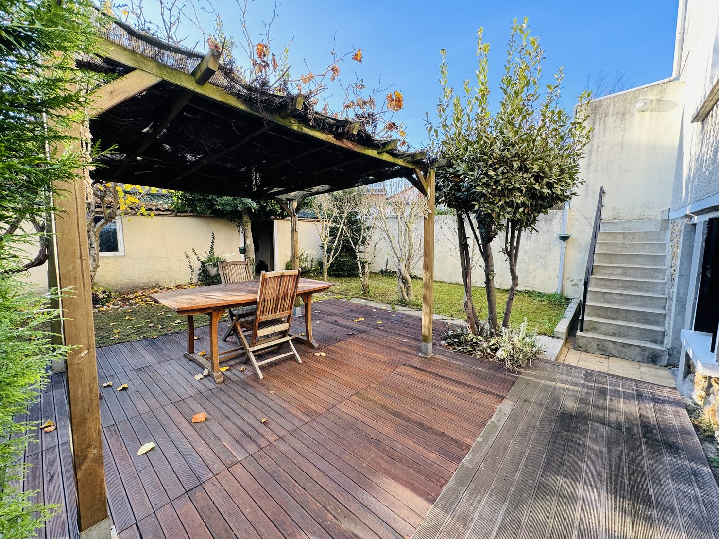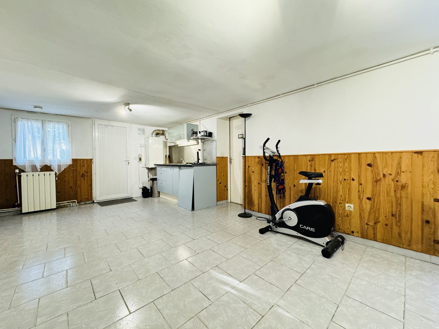 Entrée, séjour salon cheminée (39m2), cuisine équipée, wc. Au 1er : grand dégagement – bureau, 3 belles chambres avec placards, salle de bains, wc. Rez de jardin : studio de 30 m2 tout confort avec coin cuisine et salle d’eau, wc, atelier et garage. Terrain 250 m2 (sud et sans vis à vis) et abris de jardin en fond de parcelle.