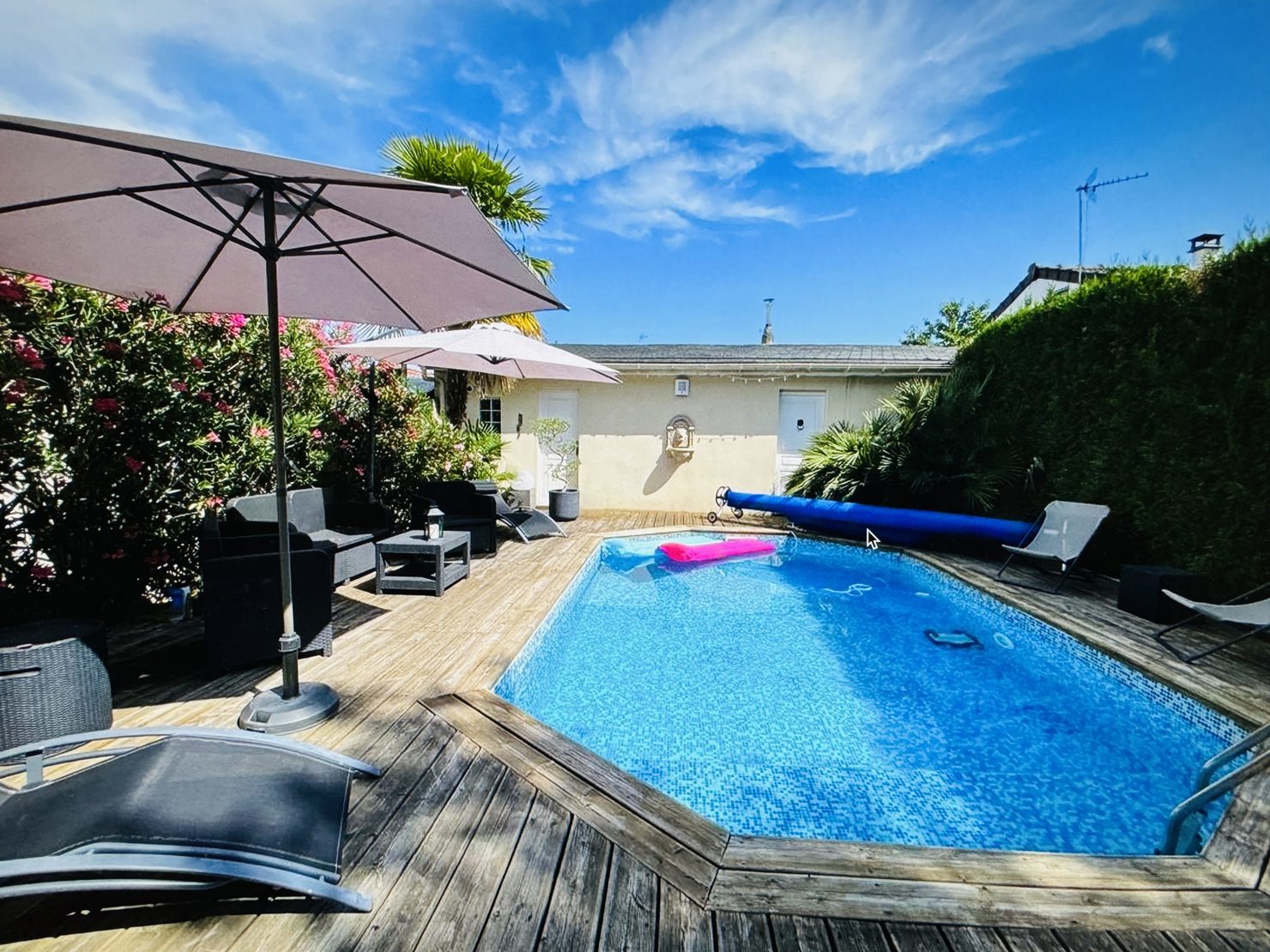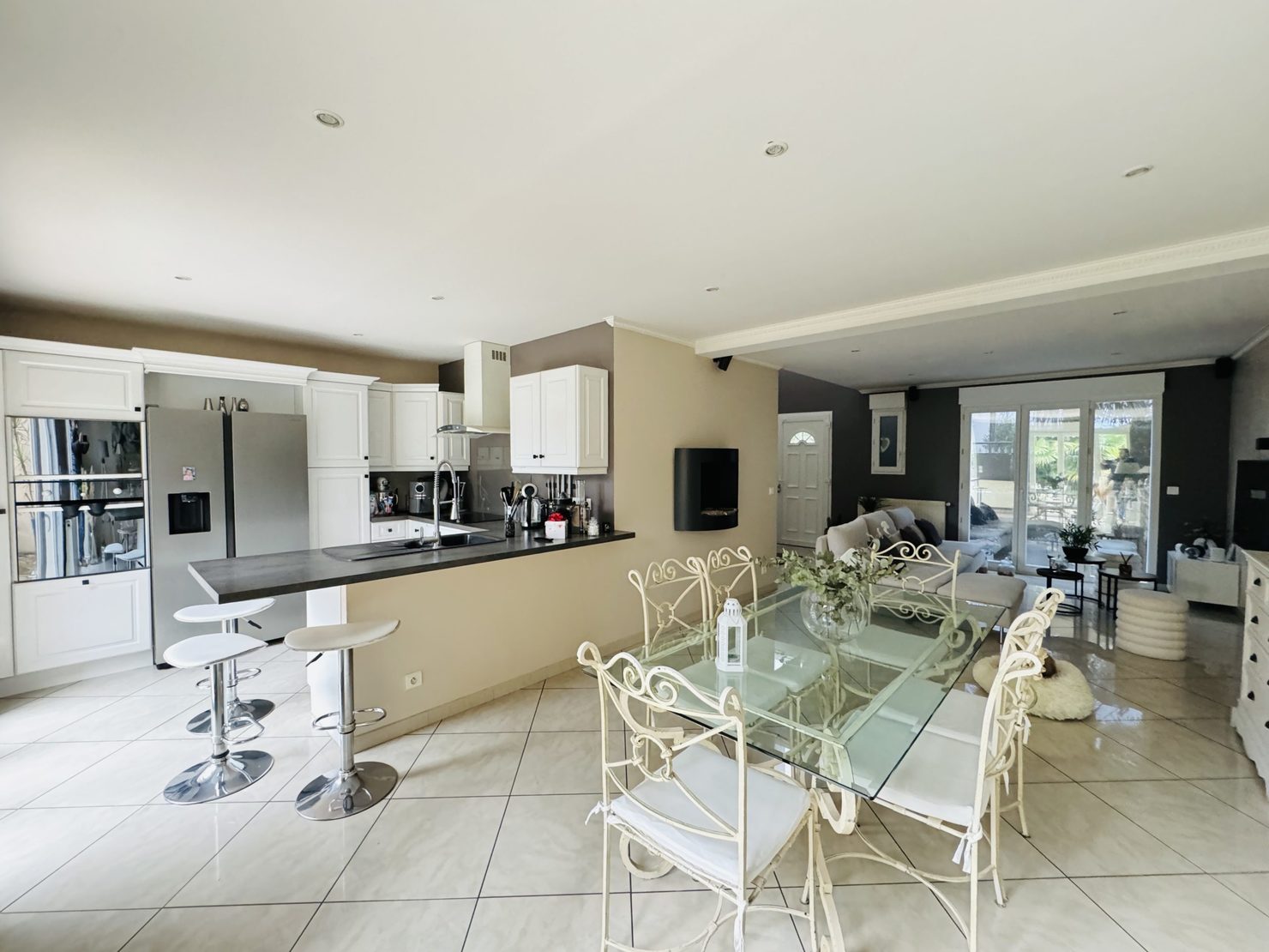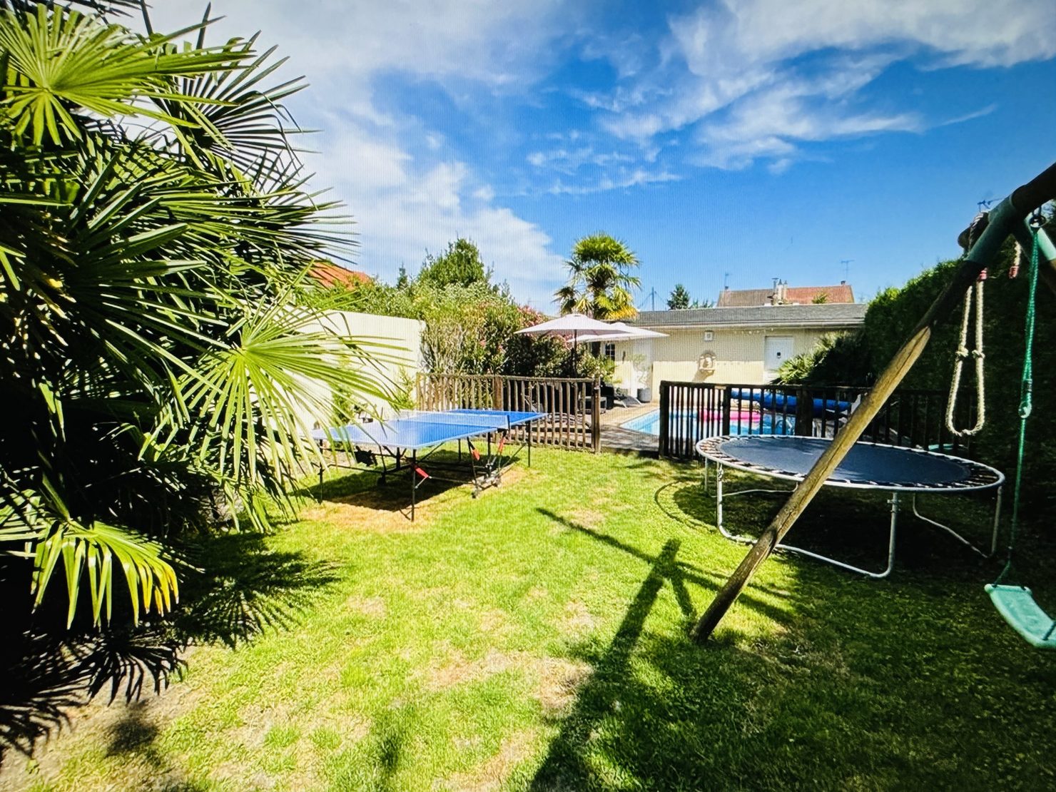 Entrée cathédrale, séjour salon cheminée avec cuisine US équipée ( 44 m2 ) sur terrasse et jardin (sud et sans vis à vis) avec piscine chauffée (6x4m), garage 2 voitures, buanderie, wc. Au 1er : suite parentale avec douche à l’italienne et placards, 3 chambres avec placards, salle de bains wc.