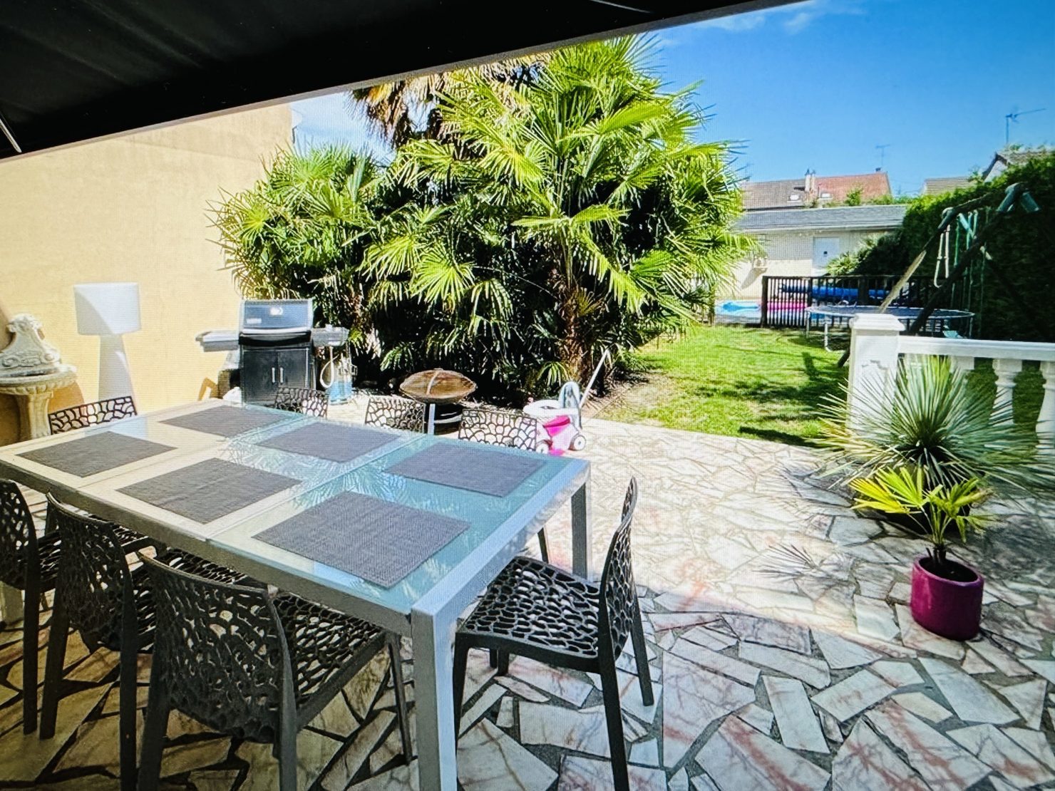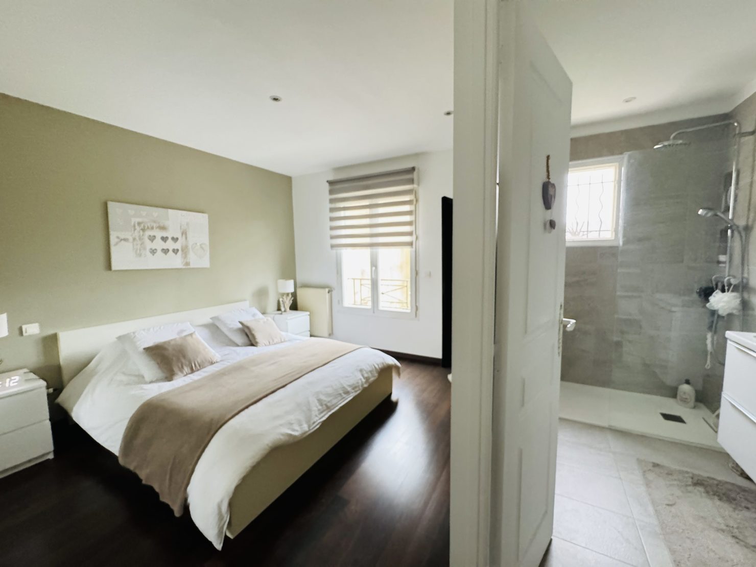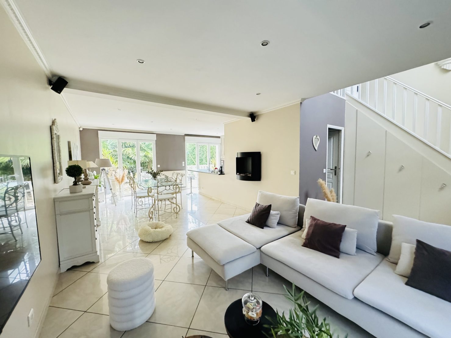 Entrée cathédrale, séjour salon cheminée avec cuisine US équipée ( 44 m2 ) sur terrasse et jardin (sud et sans vis à vis) avec piscine chauffée (6x4m), garage 2 voitures, buanderie, wc. Au 1er : suite parentale avec douche à l’italienne et placards, 3 chambres avec placards, salle de bains wc.