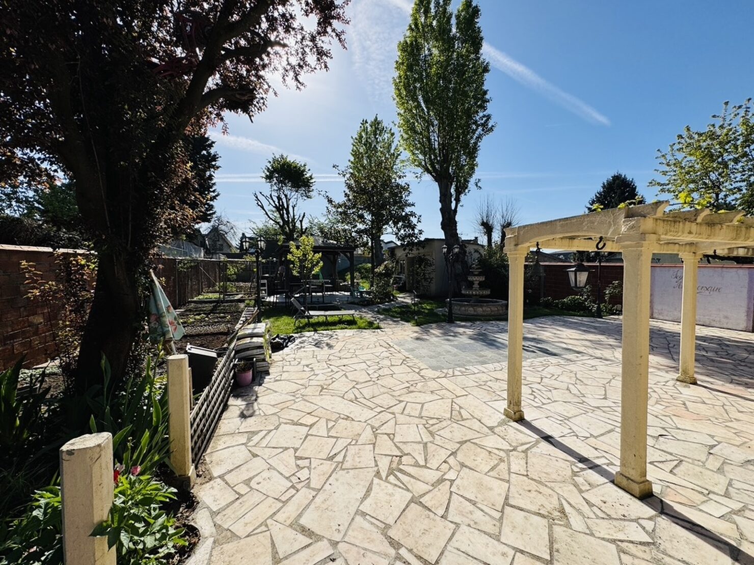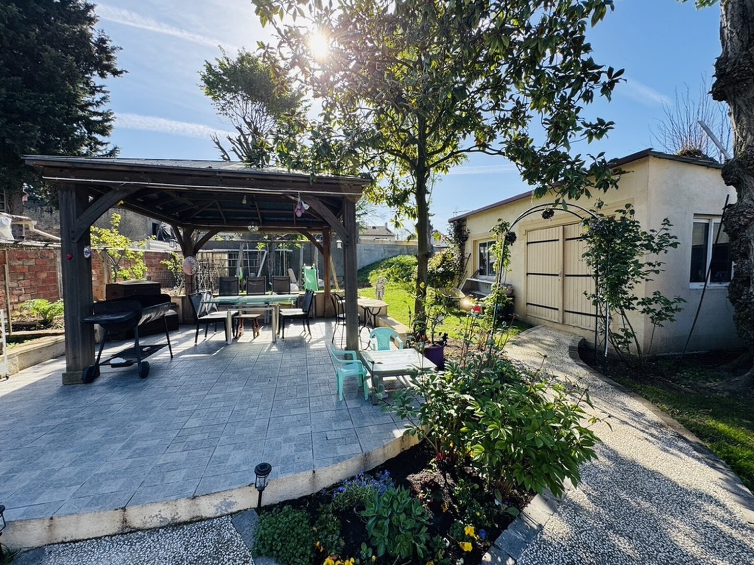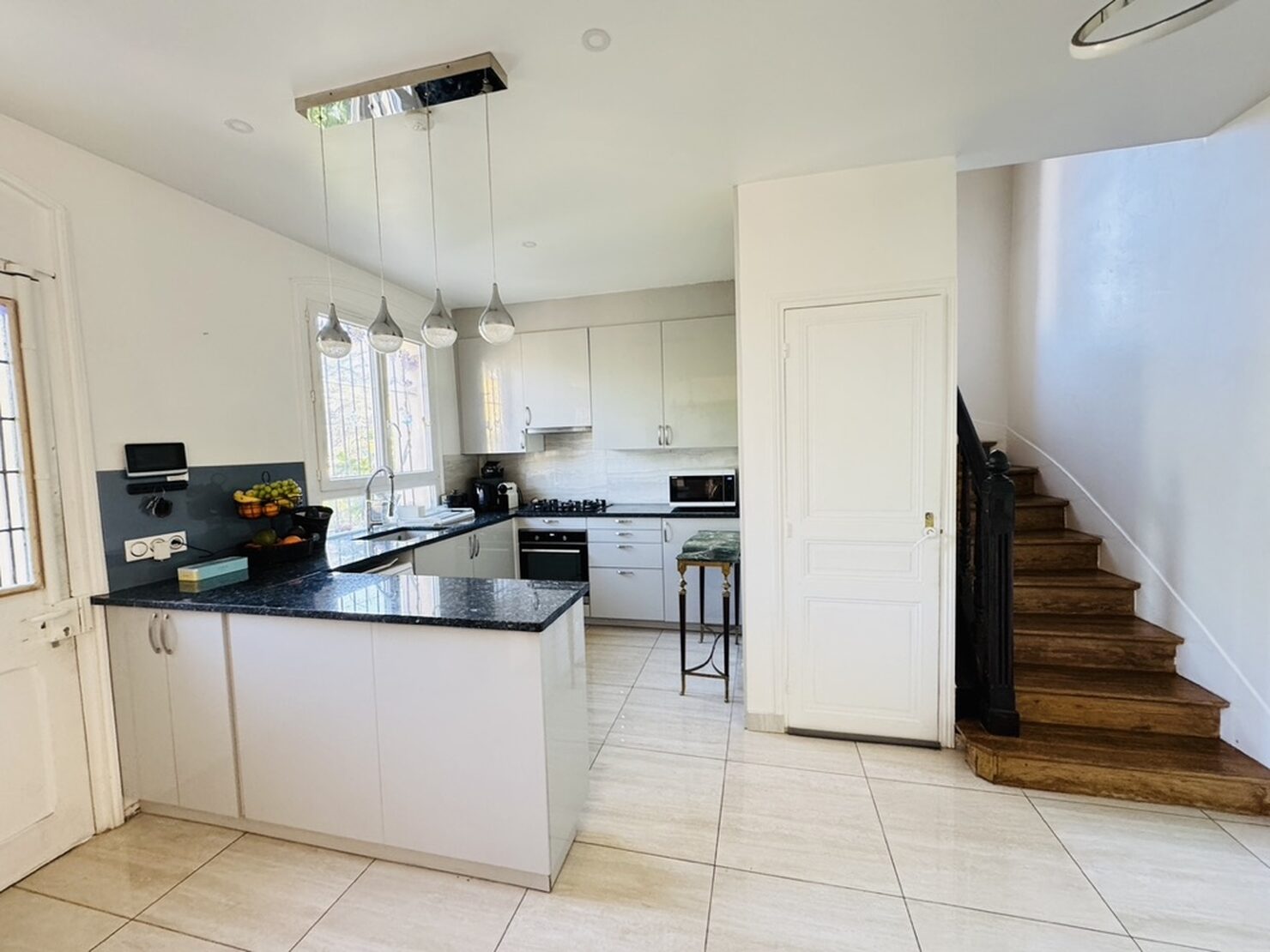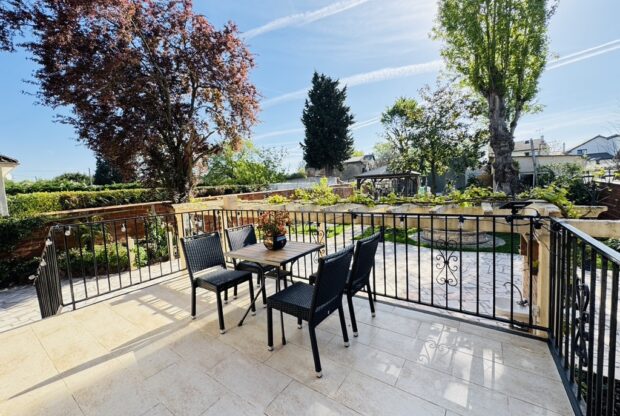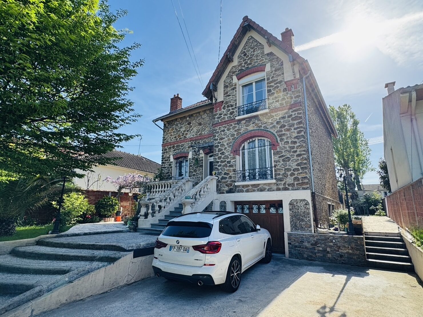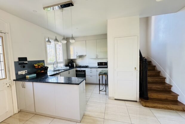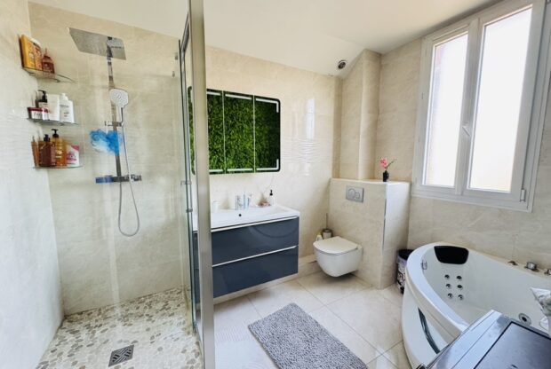 Entrée, séjour salon cheminée avec cuisine US équipée (47m2) sur terrasse et jardin sans vis à vis, une chambre avec salle d’eau douche à l’italienne, wc. Au 1er : dégagement, suite parentale avec salle d’eau wc (19,5m2), 2 chambres (15-11m2), dressing, salle de bains wc. Rez de jardin aménagée : séjour, cuisine, une chambre, salle d’eau, wc, buanderie, garage. Terrain 769 m2