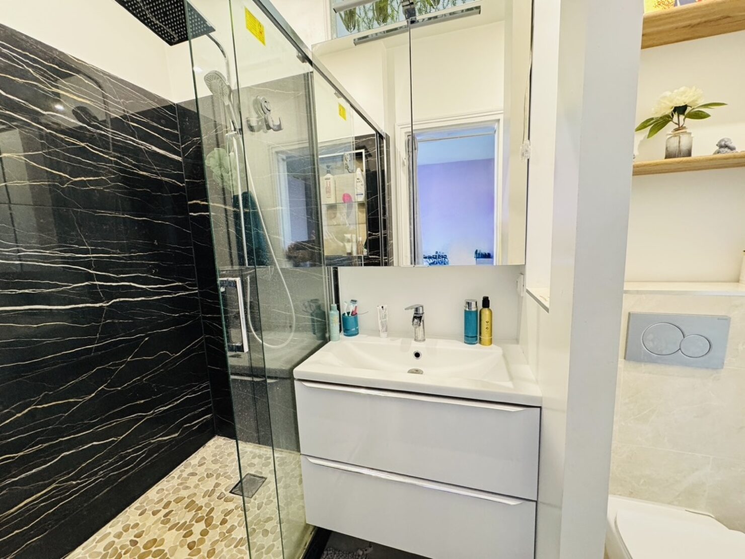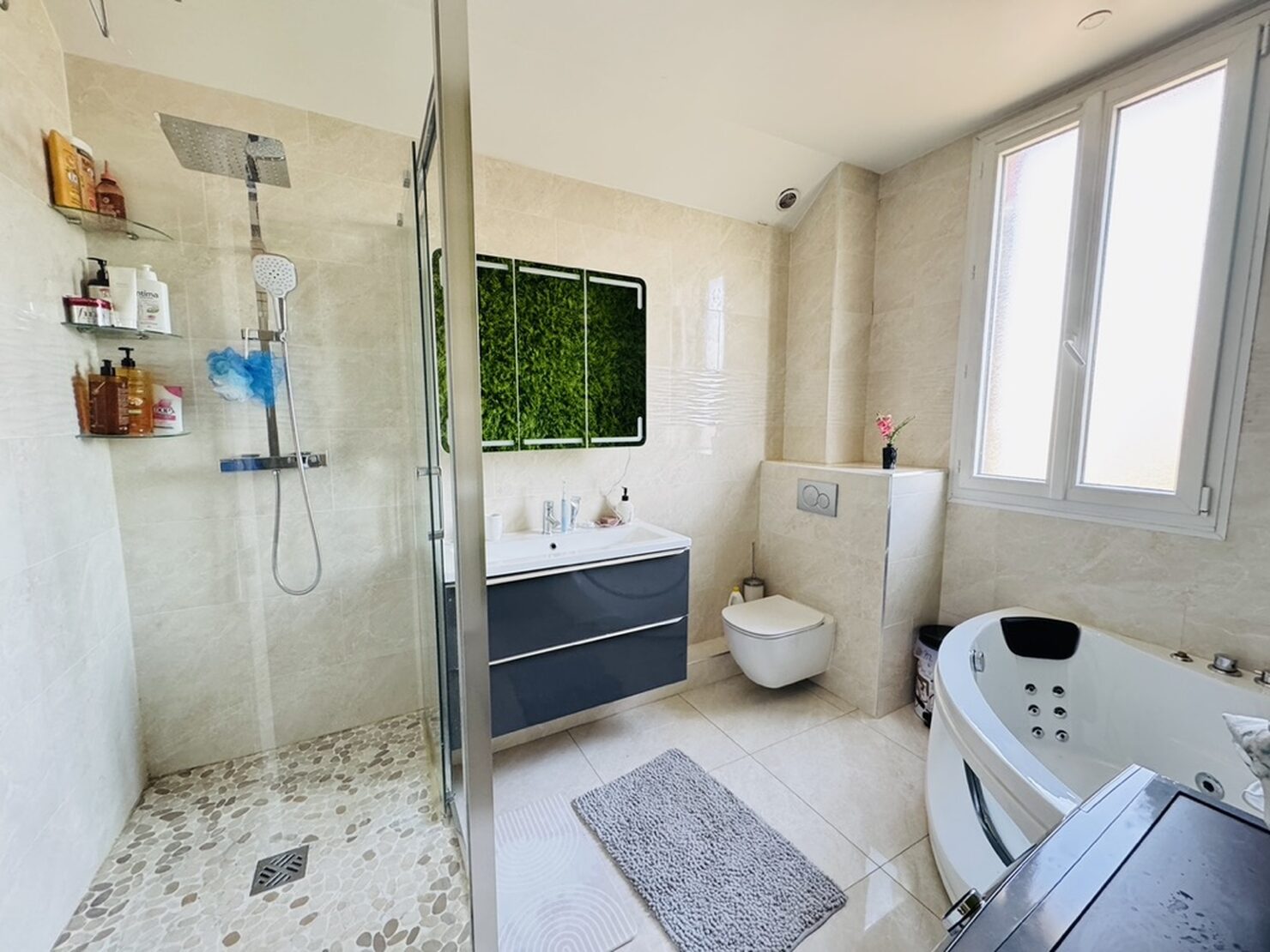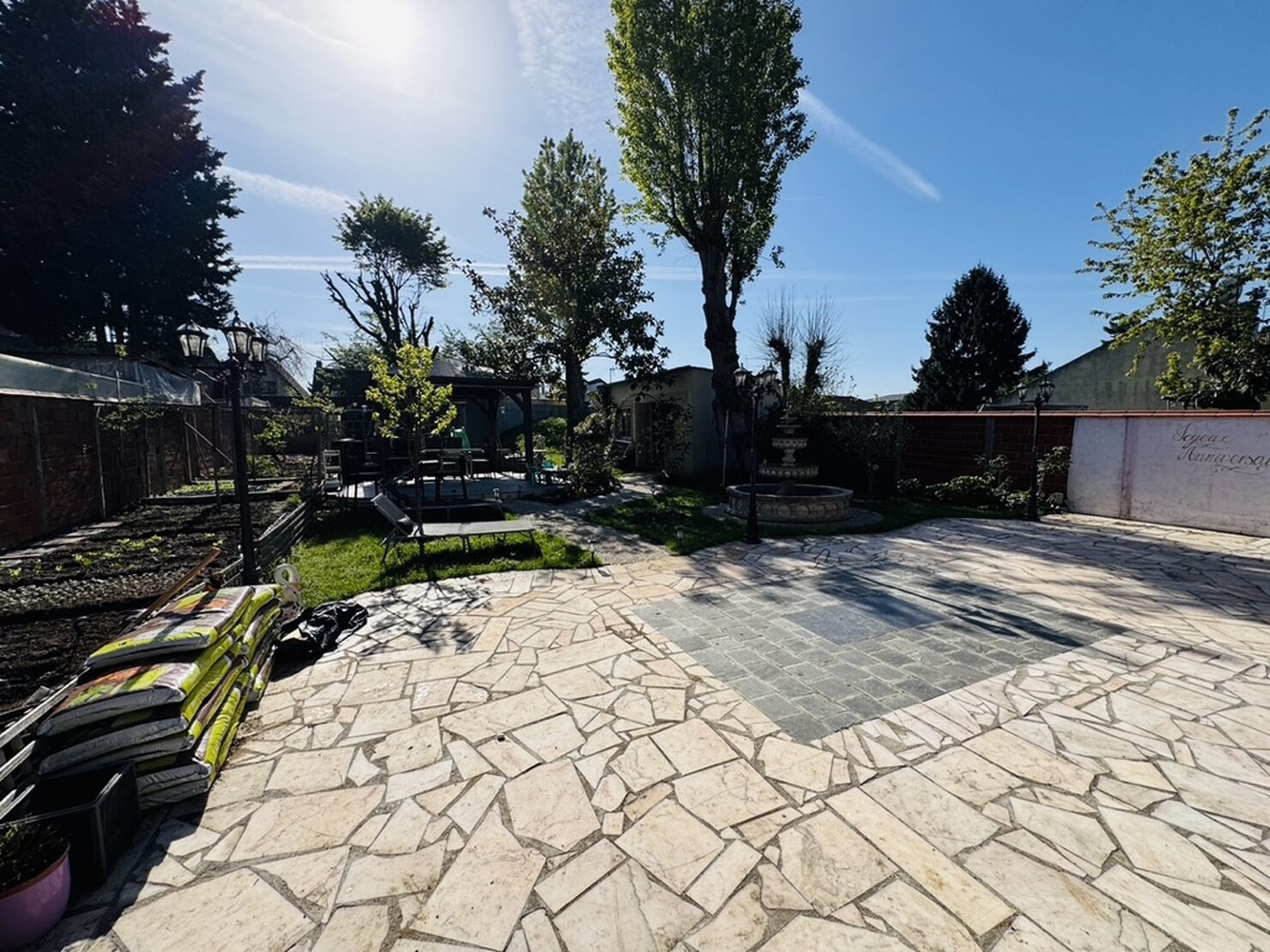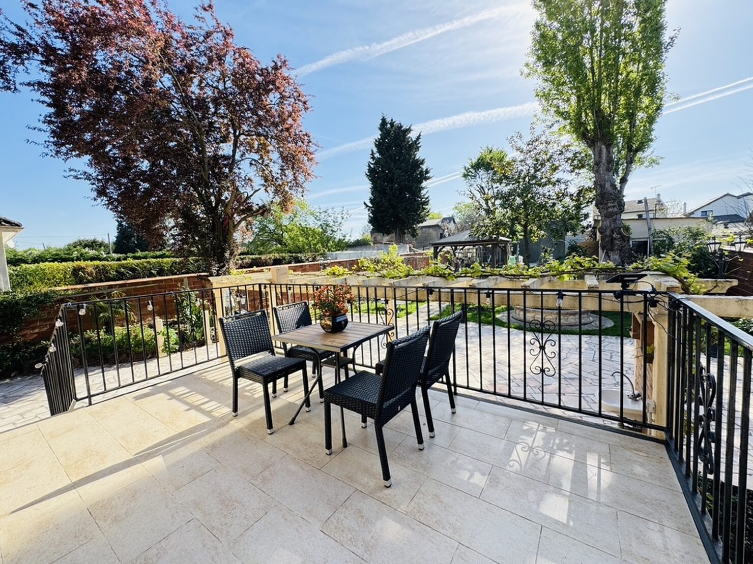 Entrée, séjour salon cheminée avec cuisine US équipée (47m2) sur terrasse et jardin sans vis à vis, une chambre avec salle d’eau douche à l’italienne, wc. Au 1er : dégagement, suite parentale avec salle d’eau wc (19,5m2), 2 chambres (15-11m2), dressing, salle de bains wc. Rez de jardin aménagée : séjour, cuisine, une chambre, salle d’eau, wc, buanderie, garage. Terrain 769 m2