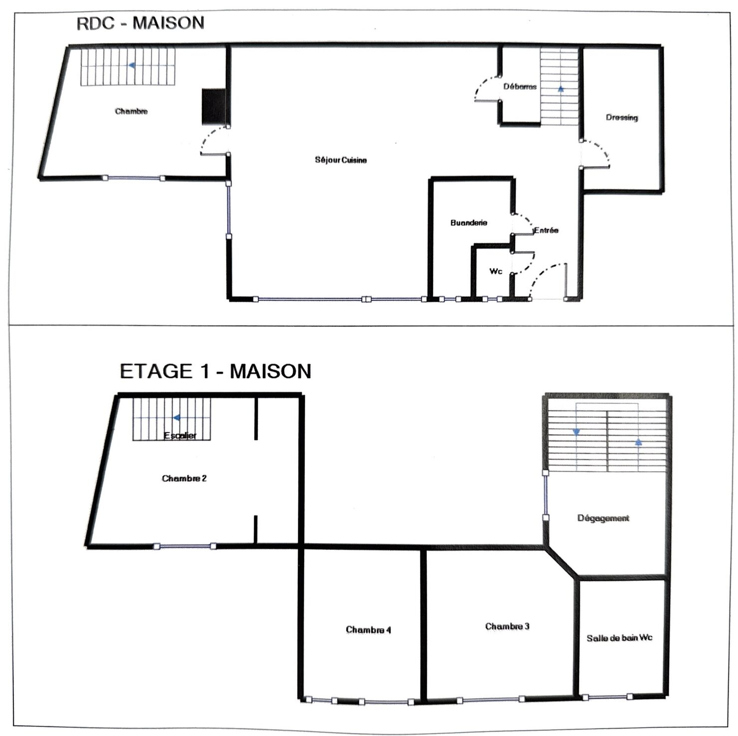 Une maison de 122 m2 (libre): entrée, séjour salon avec cuisine ( 42 m2 ), une chambre, dressing, buanderie, wc. Au 1er : 3 chambres, salle de bains wc, jardin et grand garage.